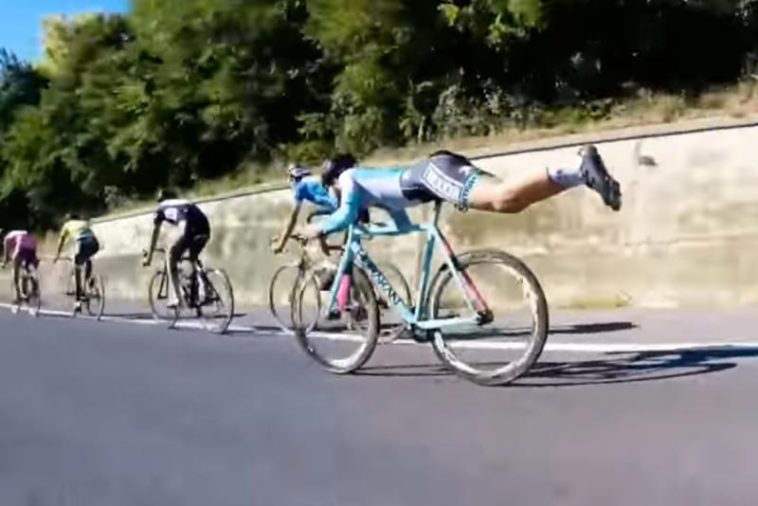 En una pendiente, un ciclista que iba en último lugar realizó un truco muy peligroso para poder superar a sus competidores.